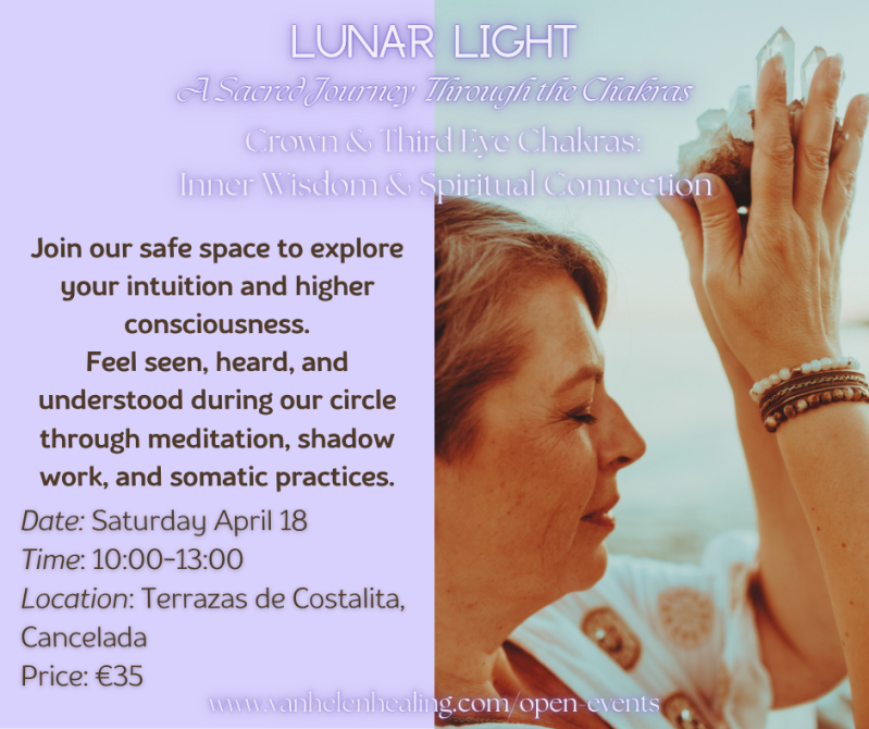 During this sacred gathering, we will guide you through a powerful visual meditation designed to open and harmonize these energy centers. Together, we will dive into profound shadow work to uncover hidden beliefs and patterns, and engage in higher awareness exercises to elevate your consciousness. Additionally, through somatic practices, you’ll deepen your mind-body connection, fostering holistic healing and self-discovery.
